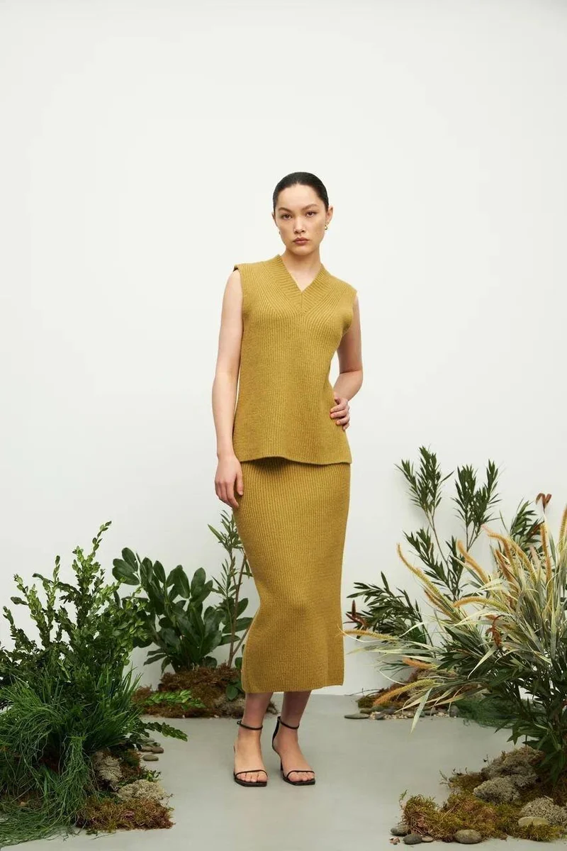 Также Papaya представили несколько нарядов из кашемира и мериноса. Вязаный жилет, юбка миди или джемпер - то, что с удовольствиями носят практически все девушки. Чувствуется, что коллекция Elements создавалась с заботой обо всех.