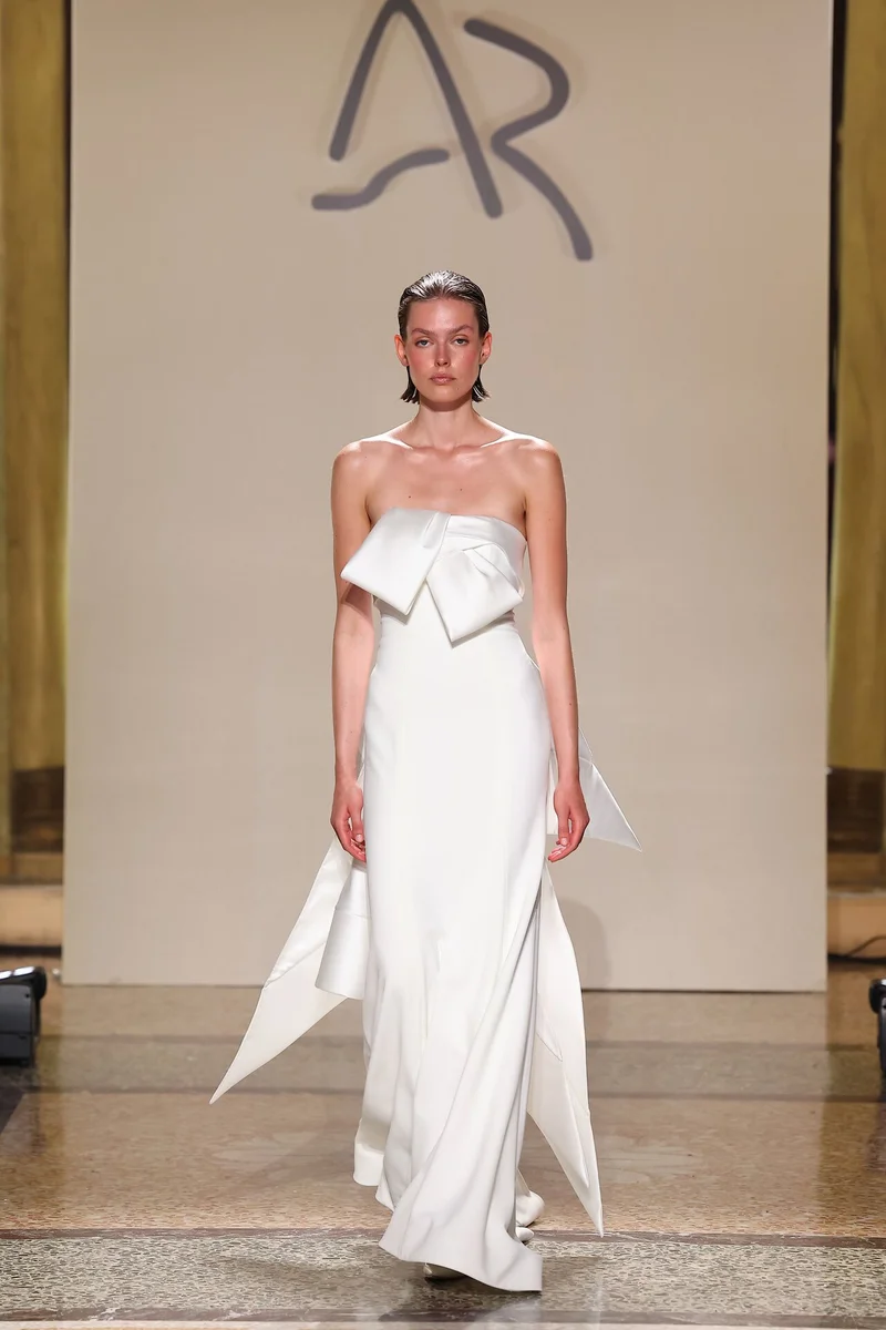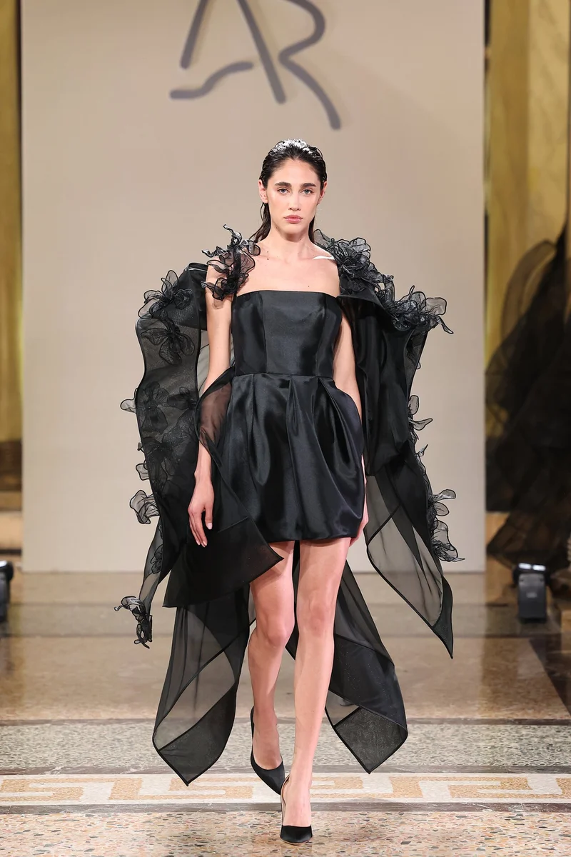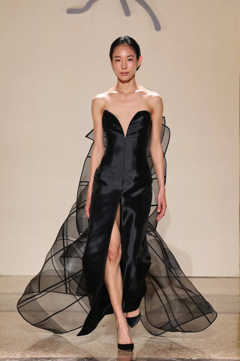 Также модельер представил несколько черных нарядов. Платье с вырезом и объемным украшением на спине вполне можно надеть на вечеринку после основной церемонии.