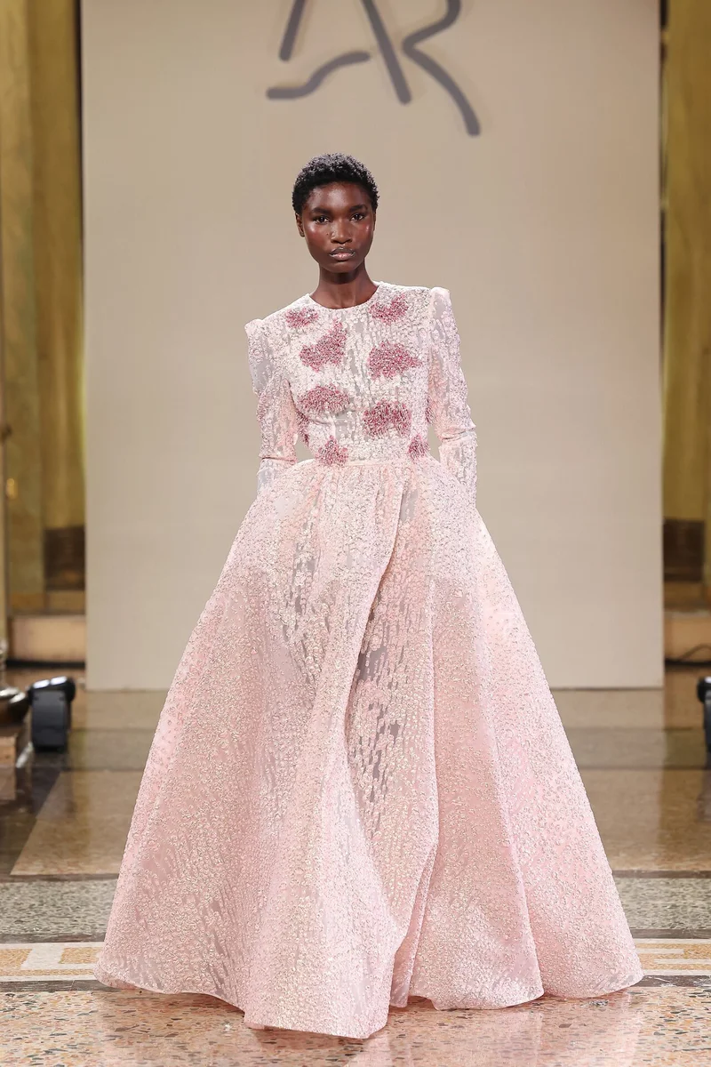 Помимо классических светлых платьев, в новую коллекцию вошли и несколько образов более ярких цветов. Розовый наряд, расшитый пайетками и бисером выглядит очень стильно и элегантно.