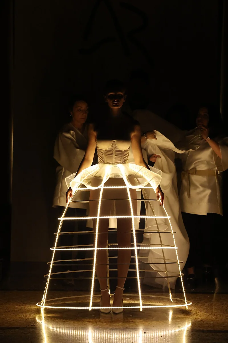 На шоу в Милане дизайнер представил также весьма необычное платье со светящимся кринолином. Этот образ собирали на модели прямо в зале показа, погасив свет. Такой эффектный ход явно понравился зрителям.