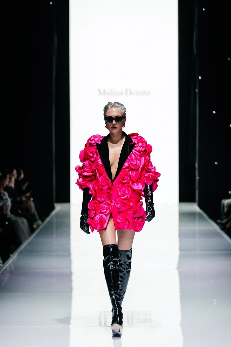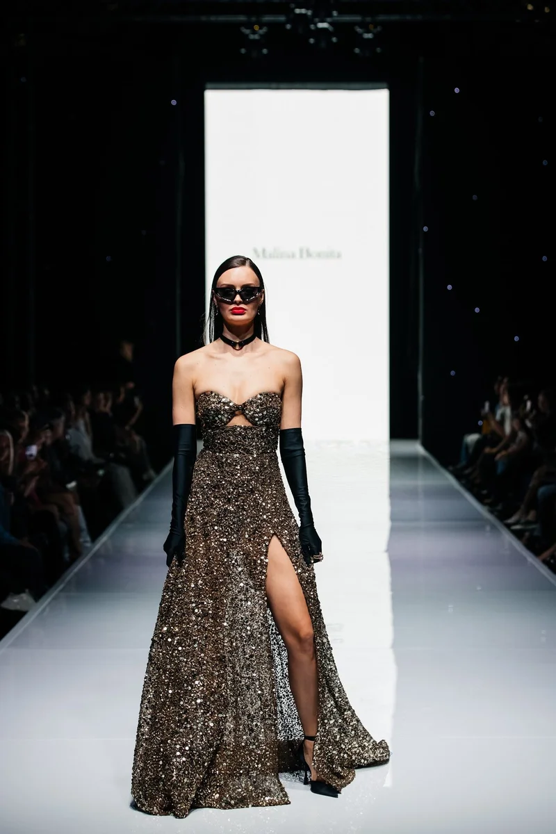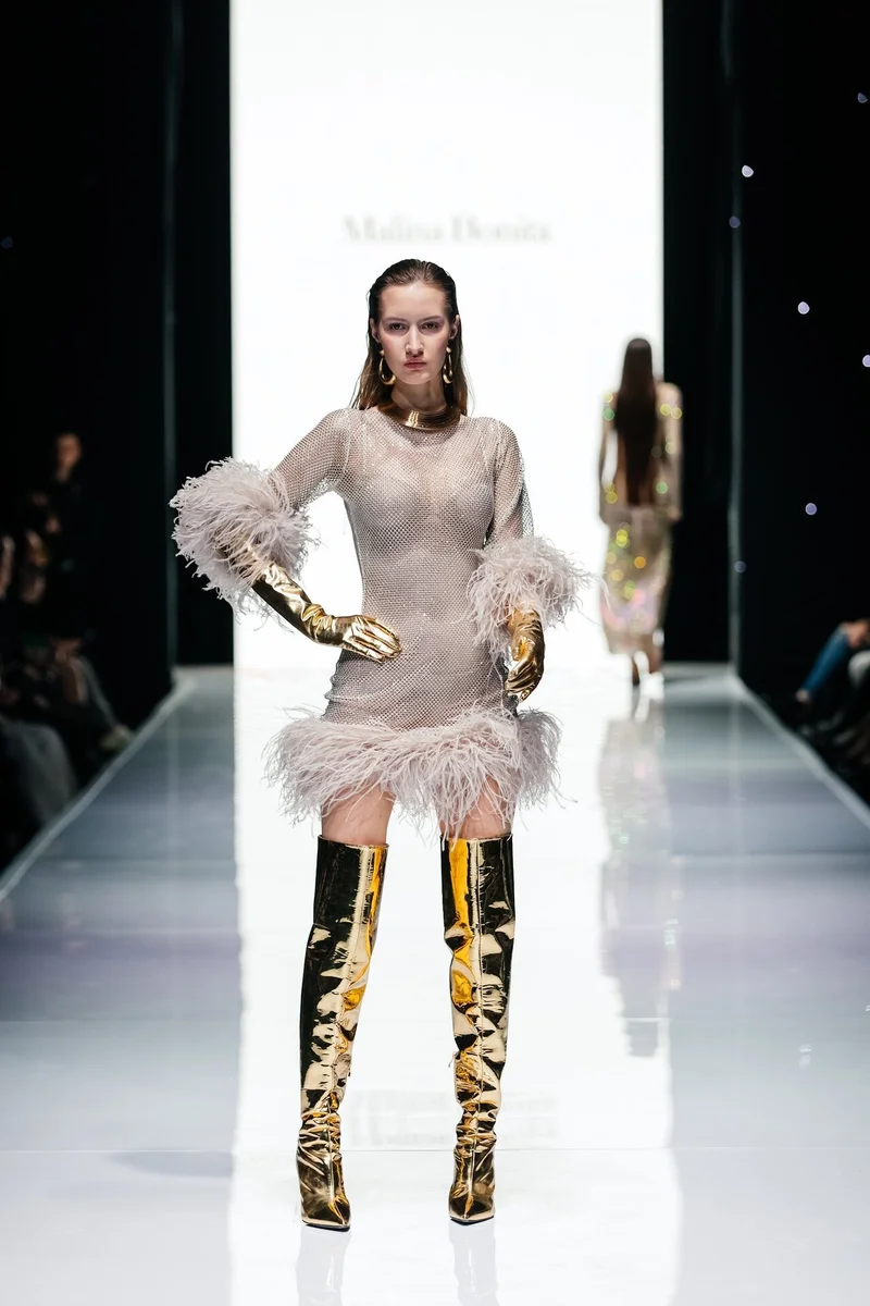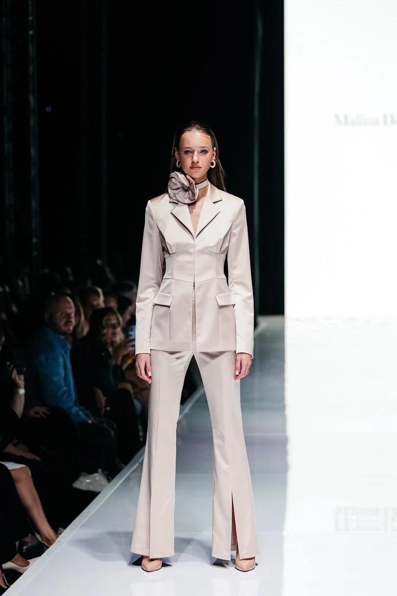 И после состоялся второй яркий показ от хедлайнера — известного бренда MALINA BONITA, чья концепция в коллекции 2023 выражена в сочетании вечернего дресс-кода и сдержанности офисного стиля. Именно такой дуализм поспособствовал получению новых лаконичных образов и форм, а лейтмотивом коллекции послужили трендовые направления нулевых, нуар, блеск во всех его проявлениях, а также переосмысление современных векторов вечерней моды. Эта основная идея выражена в инновационных материалах, произведенных на ведущих фабриках мира.