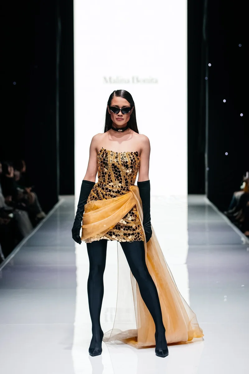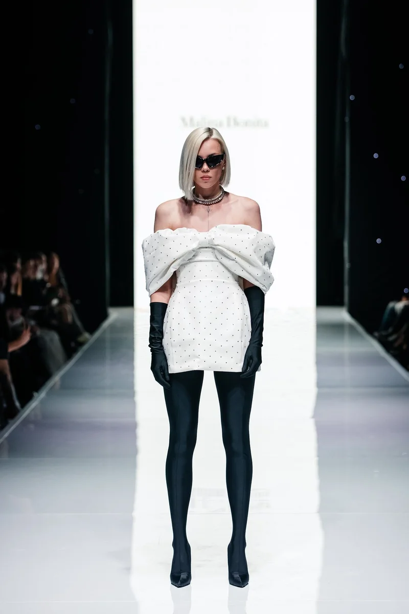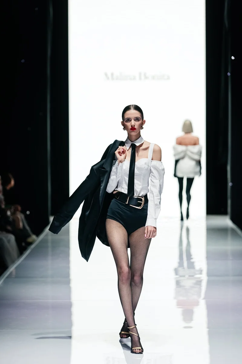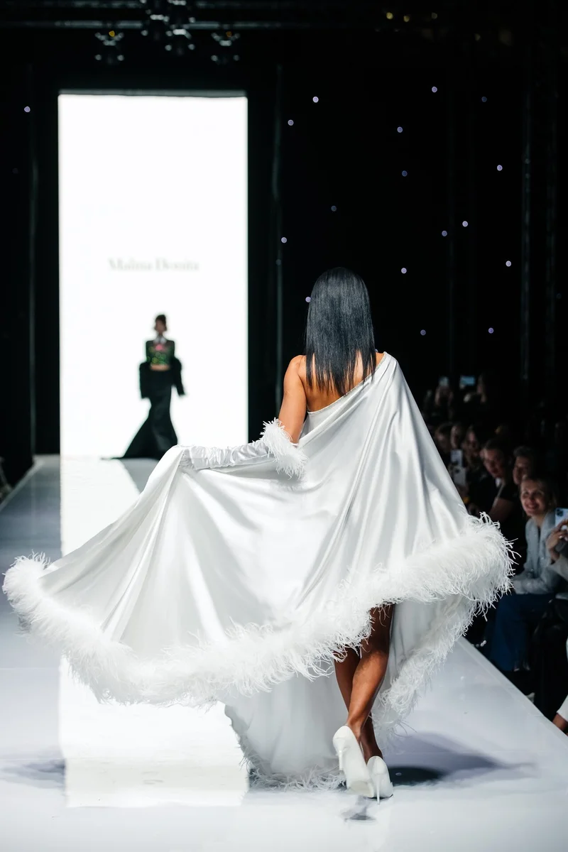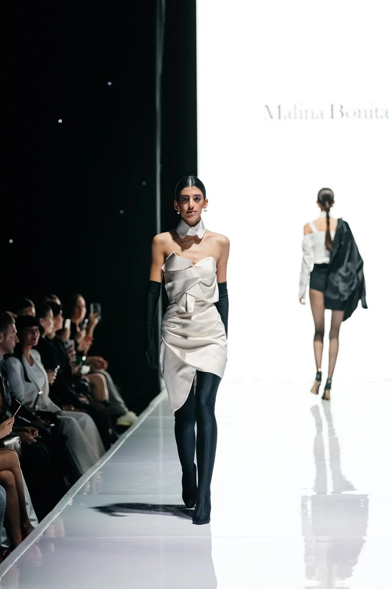 И после состоялся второй яркий показ от хедлайнера — известного бренда MALINA BONITA, чья концепция в коллекции 2023 выражена в сочетании вечернего дресс-кода и сдержанности офисного стиля. Именно такой дуализм поспособствовал получению новых лаконичных образов и форм, а лейтмотивом коллекции послужили трендовые направления нулевых, нуар, блеск во всех его проявлениях, а также переосмысление современных векторов вечерней моды. Эта основная идея выражена в инновационных материалах, произведенных на ведущих фабриках мира.