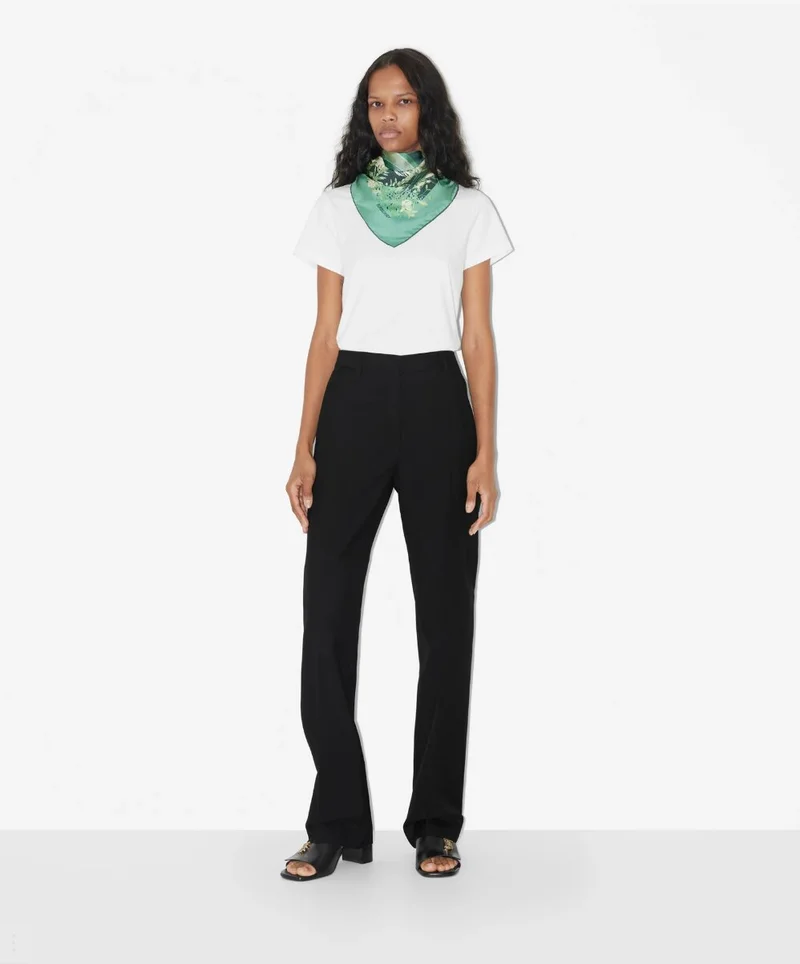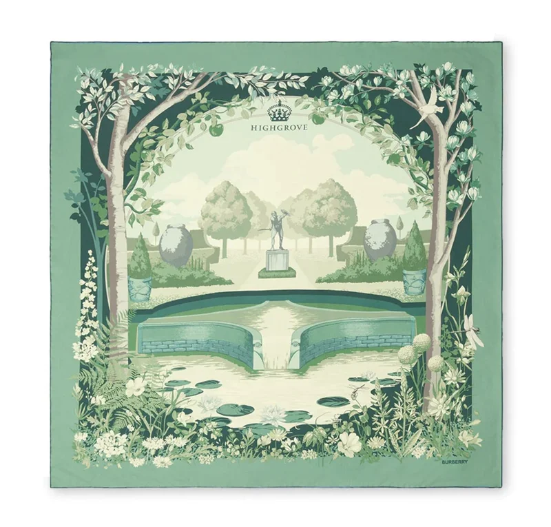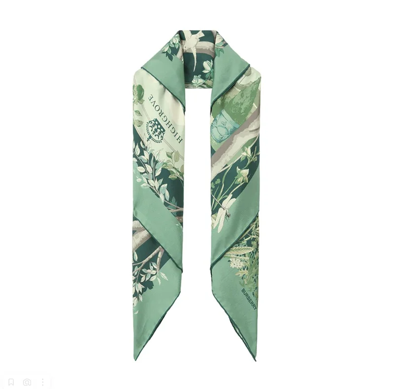 Легкая модель из органического шелка приятного зеленого оттенка выглядит очень мило. Принт повторяет вид сада со статуей, березами и магнолиями. Также дизайнеры нарисовали птиц, стрекоз и множество полевых цветов. Шарф уже поступил в продажу.