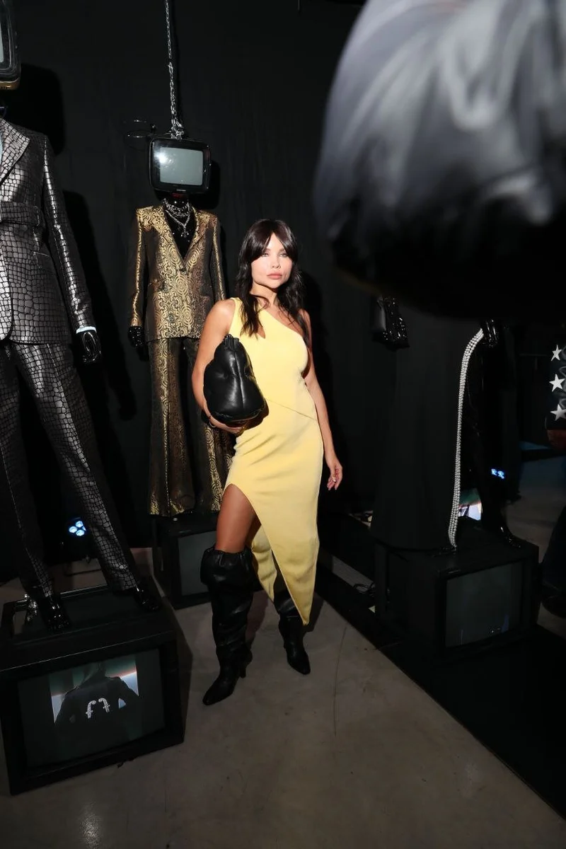 Контраст можно отследить и в сочетании цветов: платье оттенка канарейки выглядит нежно и легко, а черные сапоги и сумка делают образ более сложным и дерзким.