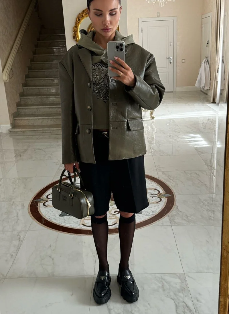 Сочетая сразу несколько базовых вещей, можно создать более сложный, многослойный образ. Так, поверх худи можно надеть кожаный пиджак со спущенной линией плеч в стиле кэжуал. Шорты свободного кроя чуть выше колен продолжают прямой силуэт, а стильное сочетание лоферов и капроновых черных гольфов — один из главных трендов сезона.