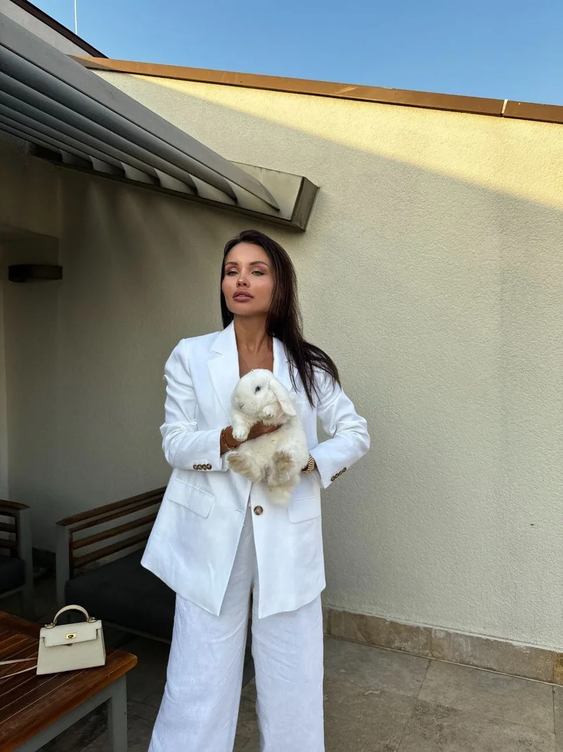 Легкий брючный костюм в белом цвете позволит создать комфортный образ как на работу, деловую встречу, так и для посещения мероприятия или прогулки по городу. Свободный силуэт создает ощущение расслабленности, при этом наличие пиджака добавляет строгость.