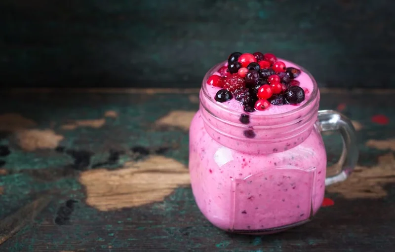 Для этого рецепта подходят как замороженные, так и перетертые с сахаром ягоды. Для смузи понадобится 1 банан, 150 мл миндального или соевого молока, по 100 г ягод и овсяных хлопьев. Подсластить напиток можно медом.
