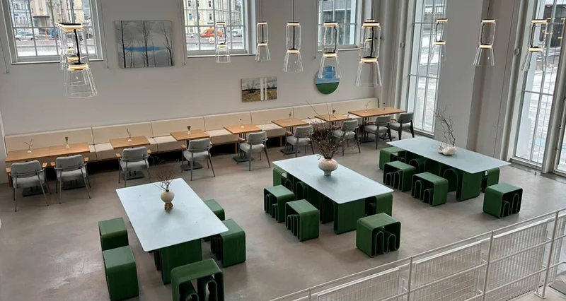 Итальянский ресторанчик с минималистичным интерьером занимает сразу 3 уровня. Помимо яркой зеленой мебели в дизайне почти нет акцентов, только картины с изображением природы.