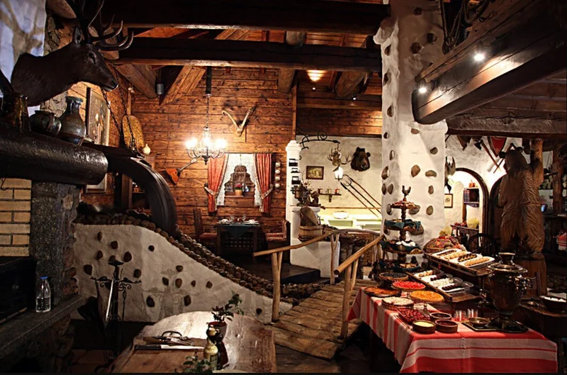 На фоне остальных ресторанов это место выделяется своим меню, поскольку здесь туристам предлагают попробовать традиционную охотничью русскую кухню. Большинство блюд готовятся в дровяной печи. Особой популярностью пользуется кролик, стерлядь, утка с потрошками, гречневая каша с грибами. На территории ресторана есть редкие коллекции и вещи в старорусском формате, которые позволяют еще больше проникнуться историей.