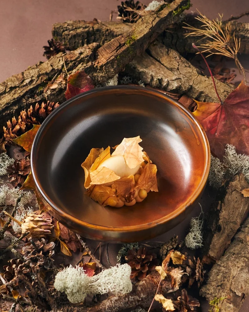 Печеное яблоко в карамели, с карамелизованным грецким орехом, миндальным крамблом, карамелью из квашеной капусты, сорбетом из печеного яблока, украшенного чипсами сельдерея и капусты. Источник фото: социальные сети ресторана (bobospb.ru)