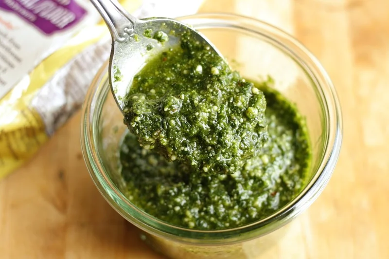 Готовый песто при необходимости довести до вкуса с помощью соли и сока лимона, затем переложить в контейнер для хранения.