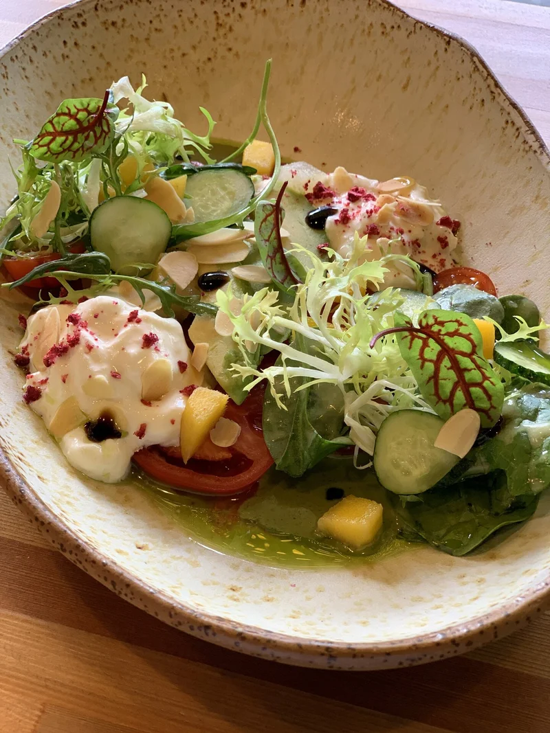 Украсить блюдо кубиком манго, слайсом огурца, миндальными лепестками и малиной. Салат от шеф-повара Lark cafe готов. Приятного аппетита!