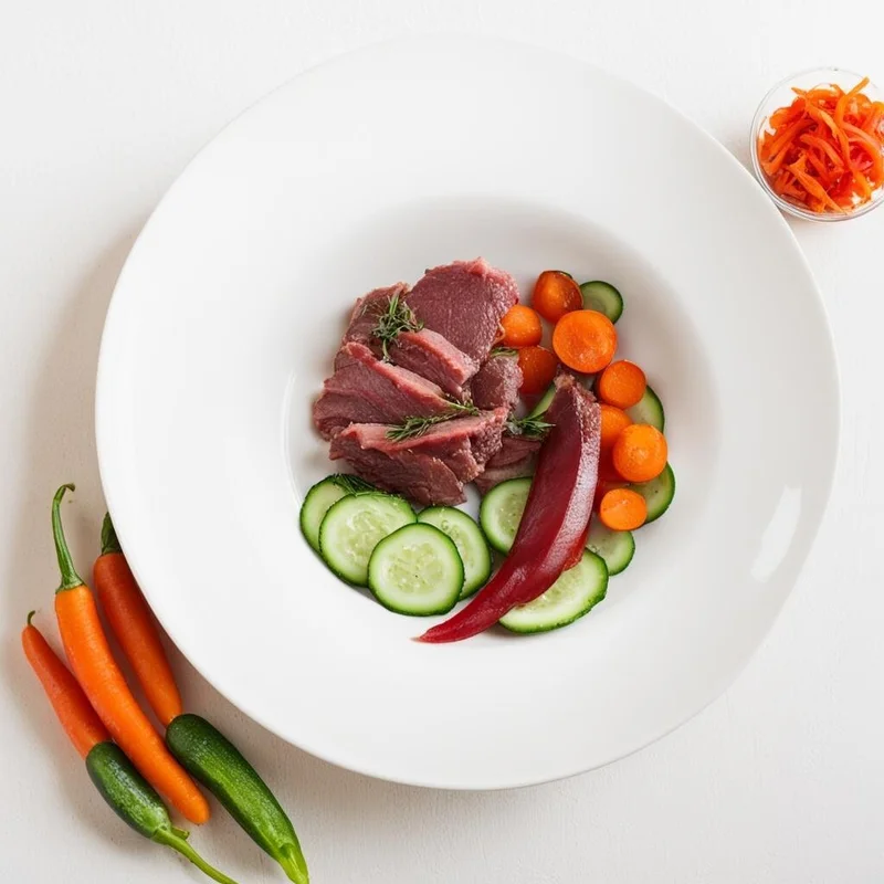 В большой салатной тарелке соединить утиное филе, морковь, огурец, красный перец, говяжий карпаччо и зеленый лук. В отдельной миске смешать соевый соус, рисовый уксус и оливковое масло. Заправить салат полученным соусом, перемешать и посыпать черным кунжутом.