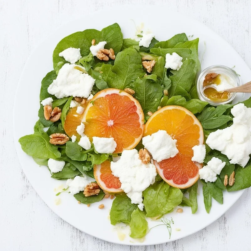 В большой салатнице соединить цедры апельсина и грейпфрута. Добавить рукколу, козий сыр и грецкие орехи. В миске смешать мед, оливковое масло, соль и перец. Заправить полученным соусом салат и аккуратно перемешать.