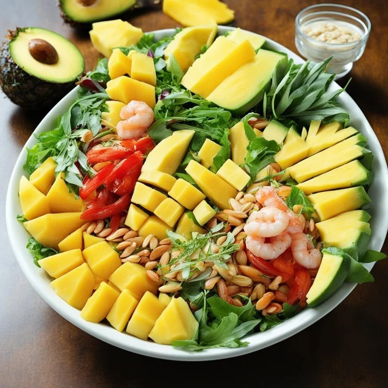 Соединить ананас, креветки, авокадо и манго в большой салатной тарелке. Посыпать сверху рукколой и измельченным миндалем, добавить соль, перец и сок лайма. Хорошо перемешать все ингредиенты. Все, салат готов!