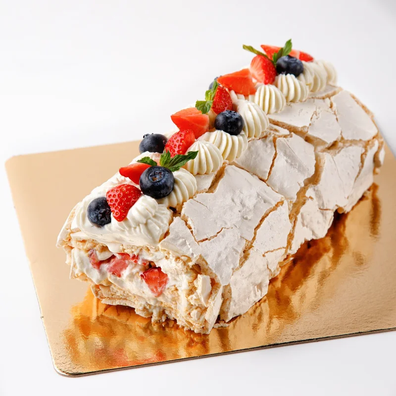 Это десерт из меренги с прослойкой из крема и ягод. Одно из популярных сочетаний — фисташка и малина. Такой рулет просто тает во рту и отлично подойдет к чаю. Сверху он хрустящий, а внутри нежный. Малина придает легкую кислинку, а фисташка имеет характерный орехово-сливочный вкус.