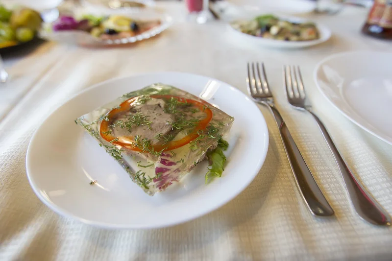 Варим эту вкуснейшую закуску в две этапа. Берем рульку и варим с нее бульон, в конце добавив желатина для густоты. Все, как на обычный холодец. Только нам в данном случае понадобится лишь желе. Отваренную рульку потом можно запечь, обмазав медом с перцем.