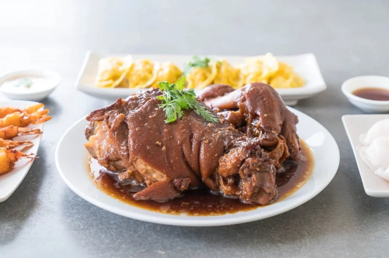 На праздничном ужине должны быть вареники (можно с разными начинками), блины и домашняя колбаса. Горячие блюда готовят с добавлением свинины. В идеале — запечь целого поросенка и поставить его рядом с кутьей. Если членам семьи такой вариант не подходит, то его можно заменить на крольчатину.