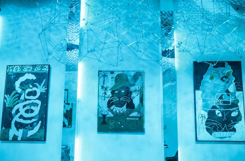 Этот бар и раньше вызывал восторг у посетителей из-за неоново-хромированных помещений, а сейчас стены еще и украсили работами Ильи Кутобоя. Тропический орнамент выглядит еще более необычно в синем цвете. Художник отдал этому бару свое самое известное полотно и вместе с шеф-поваром придумал фирменный коктейль.