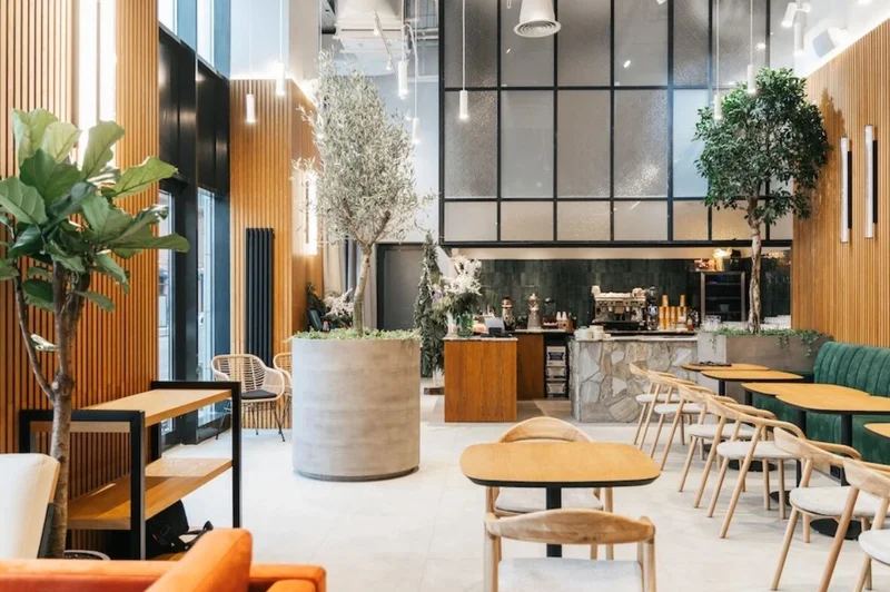 Внутри расположены дизайнерские диваны, окна в пол дают много света, зеленые растения создают уют. Формат открытой кухни позволяет наблюдать за тем, как готовят блюда. Вечерами здесь работает диджей, поэтому можно не только насладиться вкусной едой, но и потанцевать.