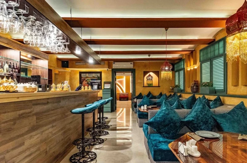 Просторные залы с мягким текстилем и длинными диванами позволяют прочувствовать атмосферу этого места. Дизайн дополнен мягкими подушками и узорчатыми лампами, которые располагают к душевному общению.