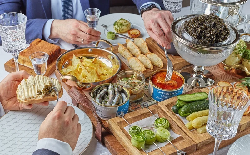 В ресторане с фирменными деликатесами можно найти целый сет для завтрака, который называется «Завтрак бурлака». Его можно заказать не только утром, но и на протяжении всего дня. Это блюдо рассчитано на 4–5 человек, больше подходит для мужской компании, которая хочет шикарно начать свой день. В сете идет 1 кг икры осетра, черный хлеб, огурчики, картошка, расстегаи с визигой. Вместо чая в комплекте идет бутылка водки или шампанского. Такой завтрак подойдет для яркого продолжения вечеринки.