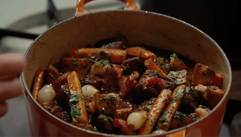 Фильм “Джули и Джулия: готовим счастье по рецепту” рассказывает о французской кухне. Одним из самых запомнившихся блюд сюжета стала говядина по-бургундски или бёф бургиньон. Мясо, тушенное в вине с беконом по рецепту Джулии Чайлд, которую сыграла Мэрил Стрип, невероятно нежное и вкусное.