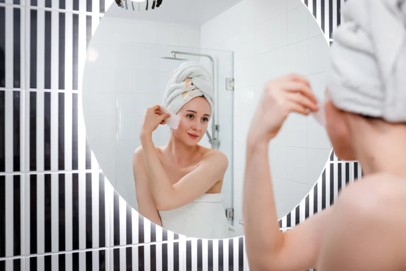 2. Еще один важный утренний ритуал для красивого и молодого лица — это массаж. Его можно делать при помощи собственных рук и с использованием скребка гуаша. Все движения должны проводиться по массажным линиям. Брать в расчет нужно и схему движения лимфы. При желании можно промассажировать и все тело: скребком или щеткой для сухого массажа. Важный момент: все процедуры с лицом должны проводиться на чистую кожу, умытую очищающей пенкой. Для лучшего скольжения нужно применять увлажняющую сыворотку или масло, не вызывающее появления комедонов.