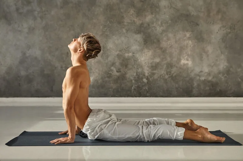 Для этого человек ложится на коврик лицом вниз, ставит руки около груди и выпрямляет их, формируя прогиб в спине. Таз при этом не должен отрываться, а плечи и грудь необходимо расправить.