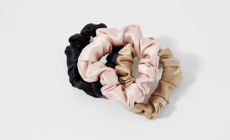 Мой набор резинок достаточно скуден - это 3 шелковых резинки черного, коричневого и бежевого цвета. Такое цветовой решение подходит под любой образ, а шелк не травмирует волосы и не заламывает их.