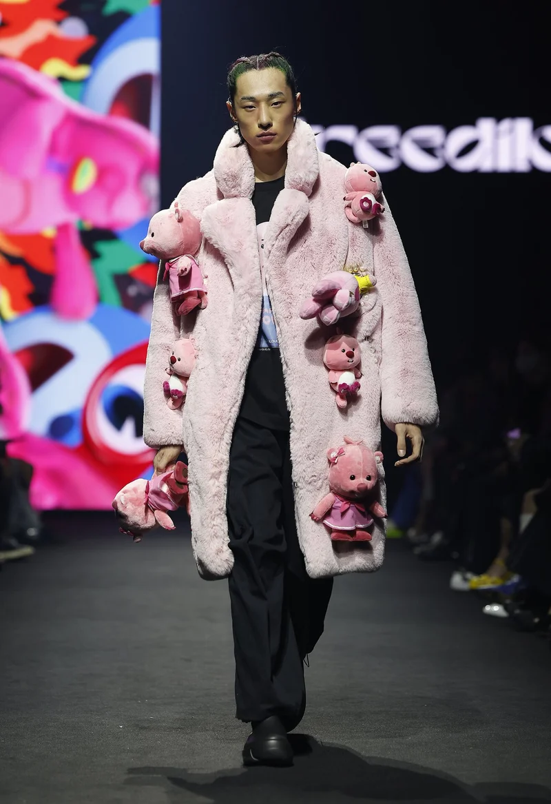 Удивительно, что и здесь появилась тема мягких игрушек. На днях LIE показали коллекцию с плюшевыми медведями. А теперь и Greedilious присоединились к новому тренду. Их розовое меховое пальто даже интереснее.