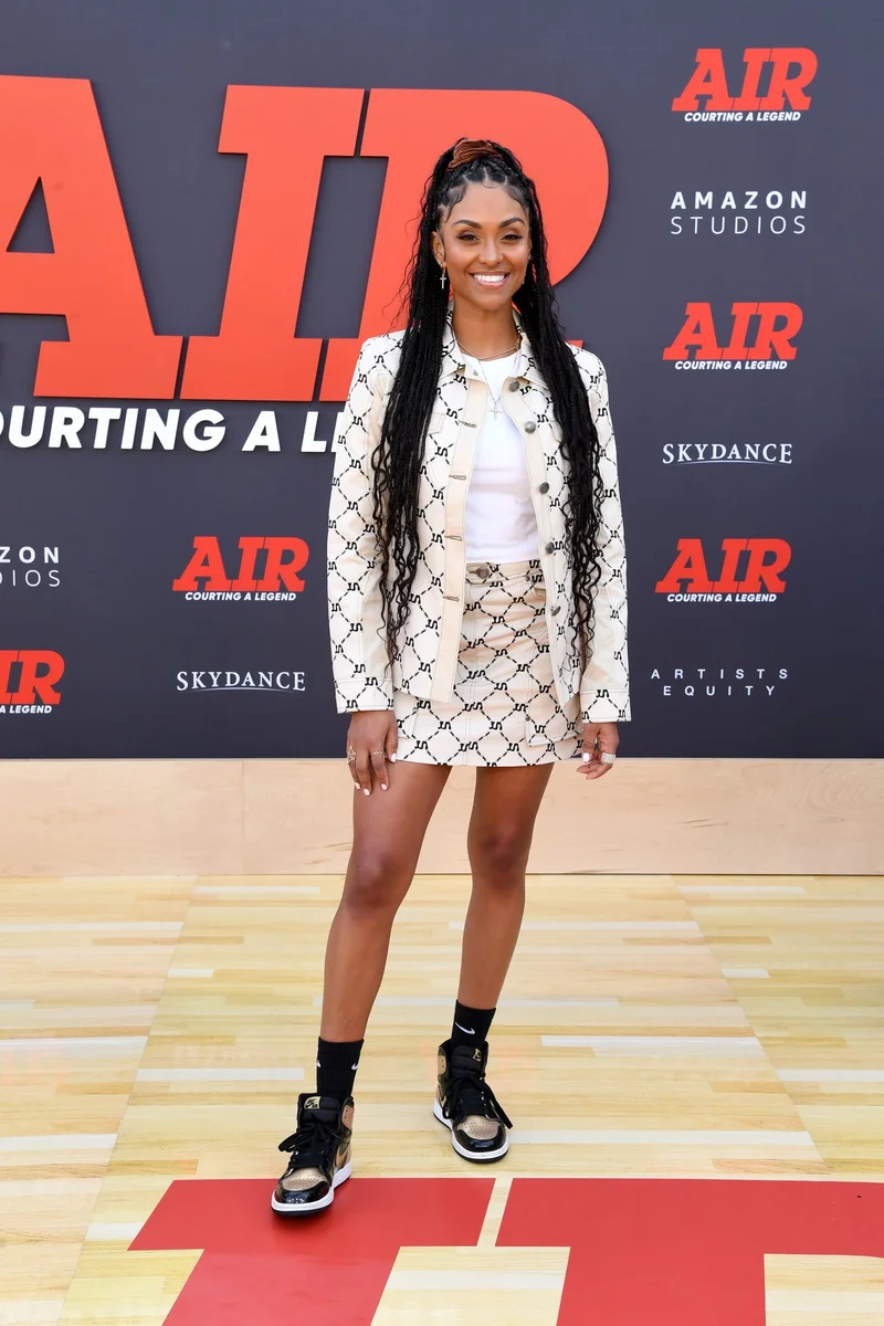 Телеведущая и блогер начинала свою карьеру с баскетбольного шоу. Разумеется, она не могла пропустить премьеру. Девушка появилась в костюме с юбкой мини и узнаваемых кроссовках с золотистыми вставками.