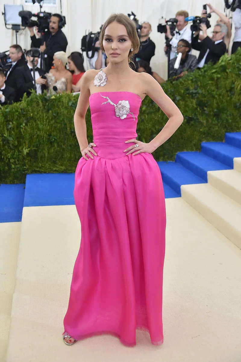 Дочь Джонни Деппа уже несколько лет является амбассадором Дома Chanel. Поэтому неудивительно, что и она появилась на Met Gala в платье этого бренда. Ярко-розовый наряд с серебристым декором и юбкой с необработанным краем - отличный выбор молодой знаменитости.