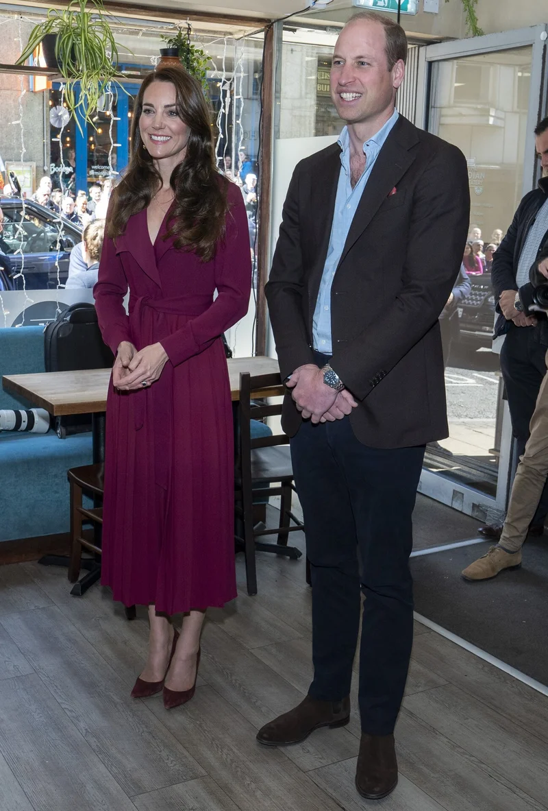 Принцесса Кейт для визита выбрала платье-тренч от Karen Millen бордового цвета и замшевые туфли в тон любимого Gianvito Rossi. Серьги Sezane с камнями двух цветов завершили элегантный образ.