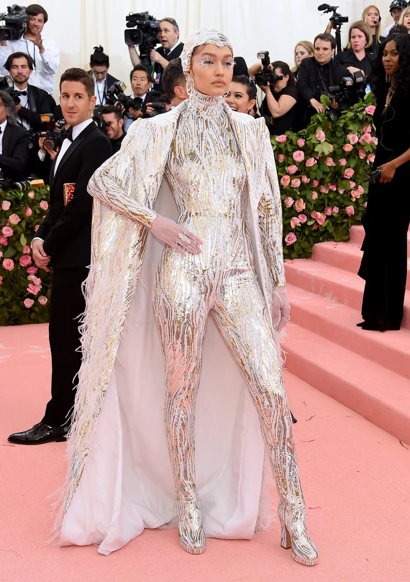 В следующем году на бале Института костюма Джиджи Хадид появилась в серебристом монокостюме Michael Kors с кейпом из того же материала. Тема некоторой переизбыточности в моде прекрасно раскрыта в этом сете - множество пайеток, перья и практически шлем на голове модели. А какой потрясающий у нее макияж!