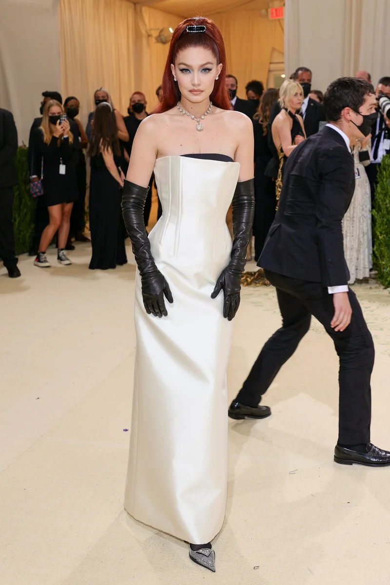 На Met Gala 2021 Джиджи появилась в образе Джессики Рэббит из знаменитого мультика. Структурное жемчужное платье Prada она обыграла черными длинными перчатками. Комплект украшений с крупными камнями и прическа с высоким хвостом идеально дополнили наряд.