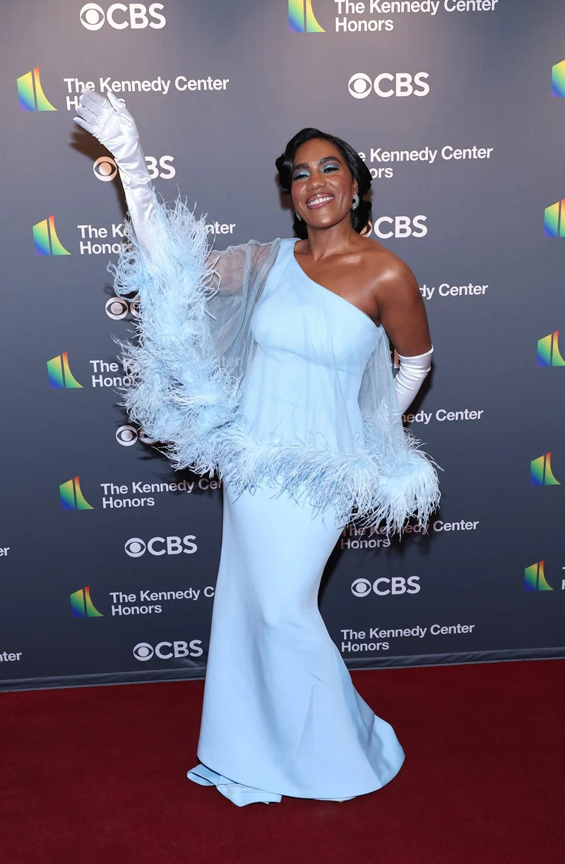 Оперная певица в голубом платье будто намекает на “золотой век” Голливуда. Белые перчатки только усиливают этот эффект.