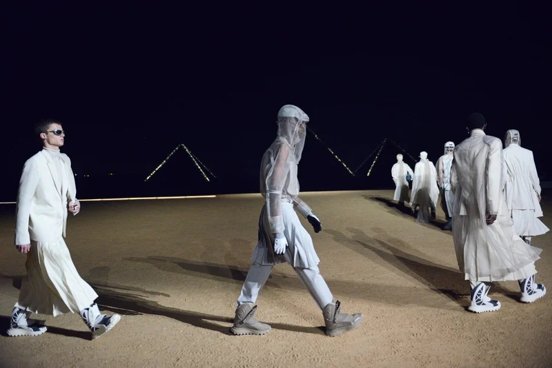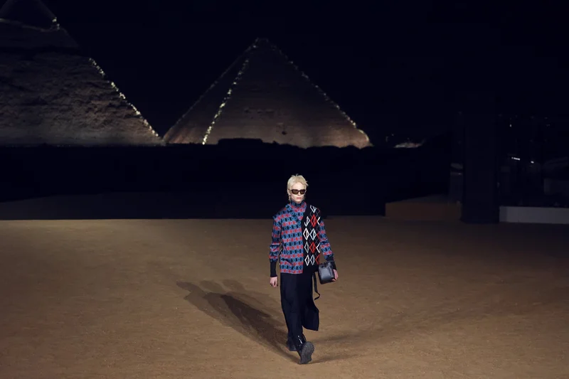 Модный показ прошел в Египте на фоне подсвечивающихся пирамид. Почетными гостями мероприятия стали Роберт Паттинсон и Наоми Кэмпбелл.