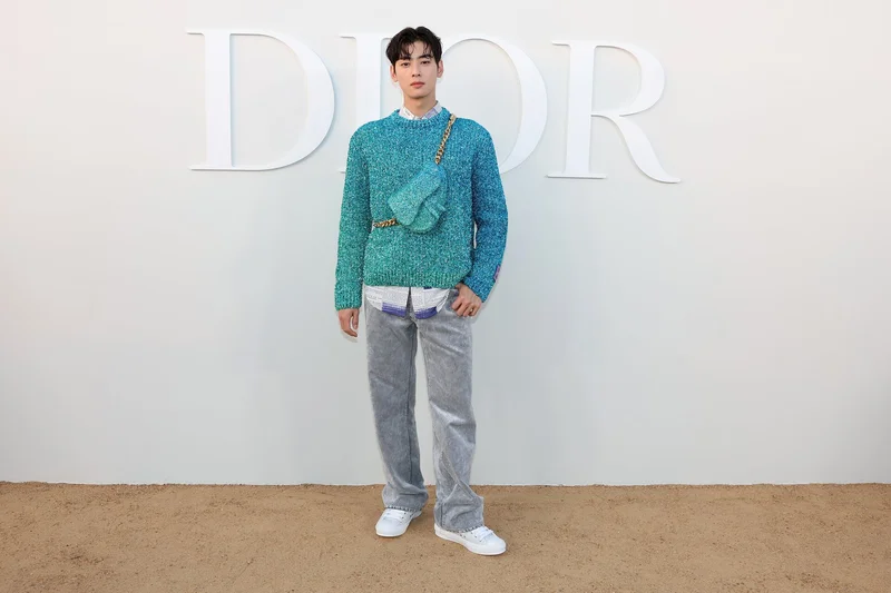 Южнокорейский певец Чха Ыну привлек к себе внимание ярко-голубым блестящим свитером и сумочкой из того же материала.