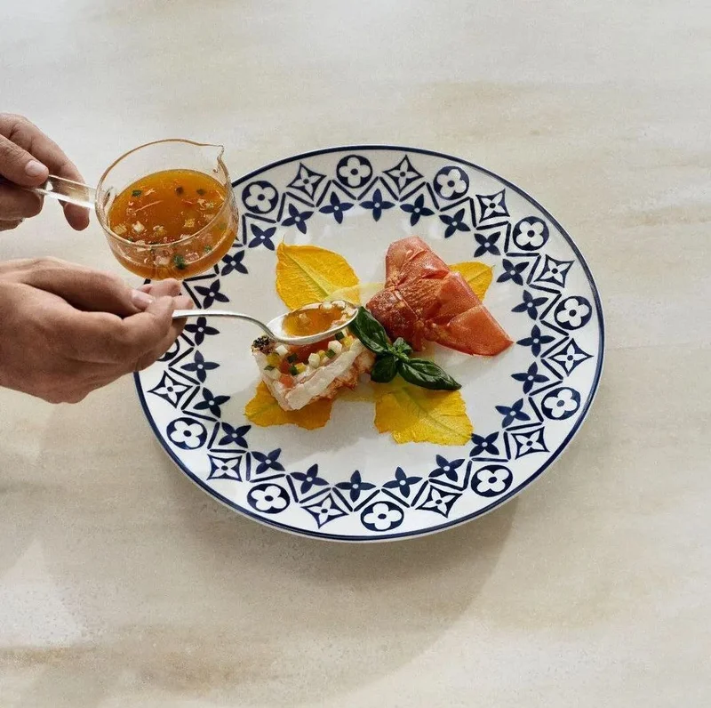 Louis Vuitton изменили дизайн кафе на бело-голубые тона, отсылающие к фирменному узору Damier Ebene. Декор вдохновлен курортной коллекцией бренда By The Pool. Плетеные кресла, подвесные фонари и стены, украшенные цветами, создают изысканную атмосферу.