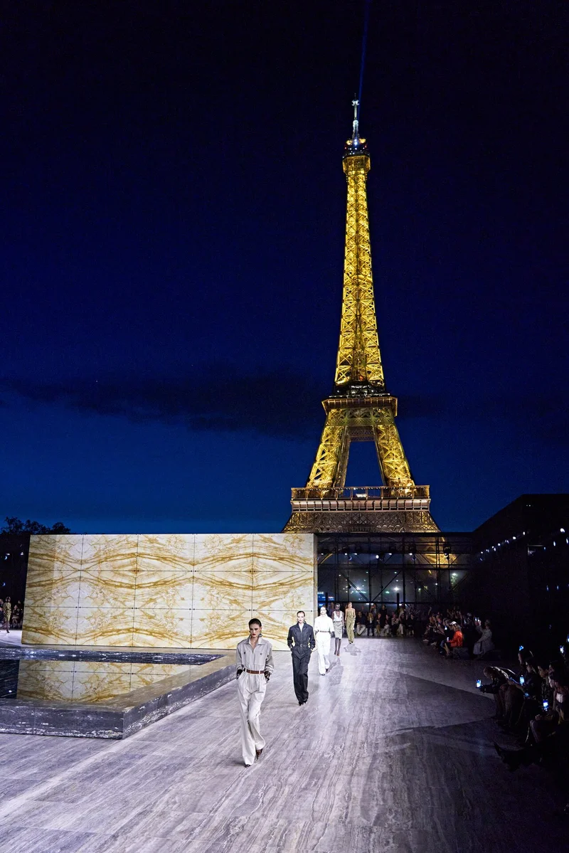 Как и в прошлом году, показ прошел на фоне Эйфелевой башни - лаконичные монолитные декорации под открытым небом создавали удивительный эффект. А музыкальное сопровождение будто гипнотизировало зрителей. Атмосфера просто невероятная!