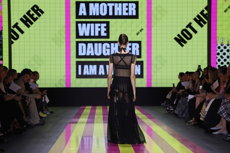 Показ проходил на фоне видеоинсталляция NOT HER итальянской художницы Элены Беллатони - слоганы на экранах говорили сами за себя. Одним из них стал "Я не жена, мать или дочь. Я женщина", который показывался дольше всех.