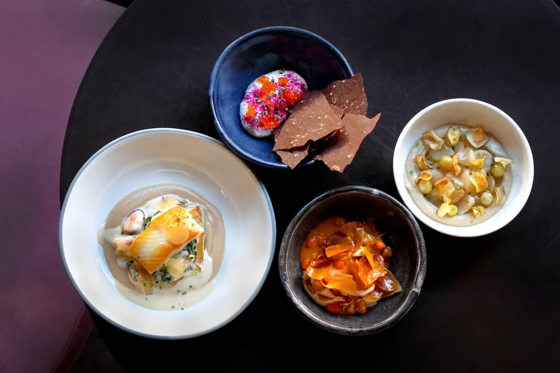Бренд-шеф Евгений Насыров решил представить богатство русских морепродуктов в сочетании с локальными сельскохозяйственными ингредиентами. Получился приятный сет из четырех позиций: тарама из печени трески с красной икрой; сахалинские гребешки с хумусом из топинамбура и маринованным крыжовником; палтус с морской капустой и соусом из мидий и мильфей с морошкой и облепихой на десерт.