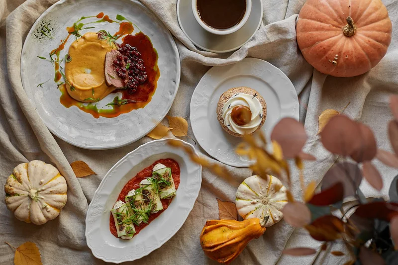 Сезонными продуктами, северной кухней и семейными традициями вдохновились шеф-повар Дмитрий Гусаров и шеф-кондитер Диана Китаева. Получился сет с насыщенными вкусами и согревающими холодными вечерами блюдами. Вместо закуски - кабачок с творожным фермерским сыром из Подмосковья, черноморским анчоусом и овощным соусом из трав и корнеплодов. В качестве основного блюда - дикое мясо с сезонными корнеплодами и пряным соусом, а на десерт - Шу с ванильно-сливочным кремом, облепиховыми пюре и карамелью.