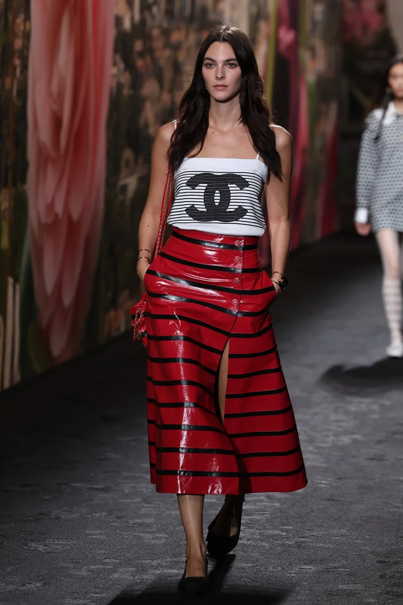 Еще одной фишкой показа стали пляжные наряды в полоску. Трогательные костюмы, топы с логотипом Дома, а также длинные юбки прекрасно дополнят летний гардероб следующего сезона.