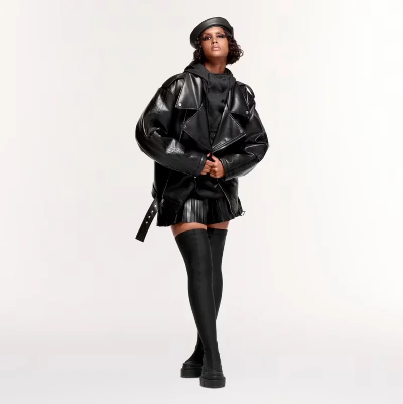 В линейку вошли и несколько моделей верхней одежды: латексный тренч, двухсторонняя куртка с капюшонов и просто невероятно крутая косуха. Также в IVY Park Noir вошли несколько пар обуви, головные уборы и сумки. Панамы из латекса и высокие сапоги с тремя полосками смотрятся стильно и эффектно.