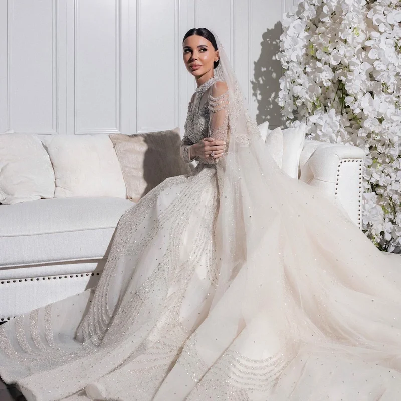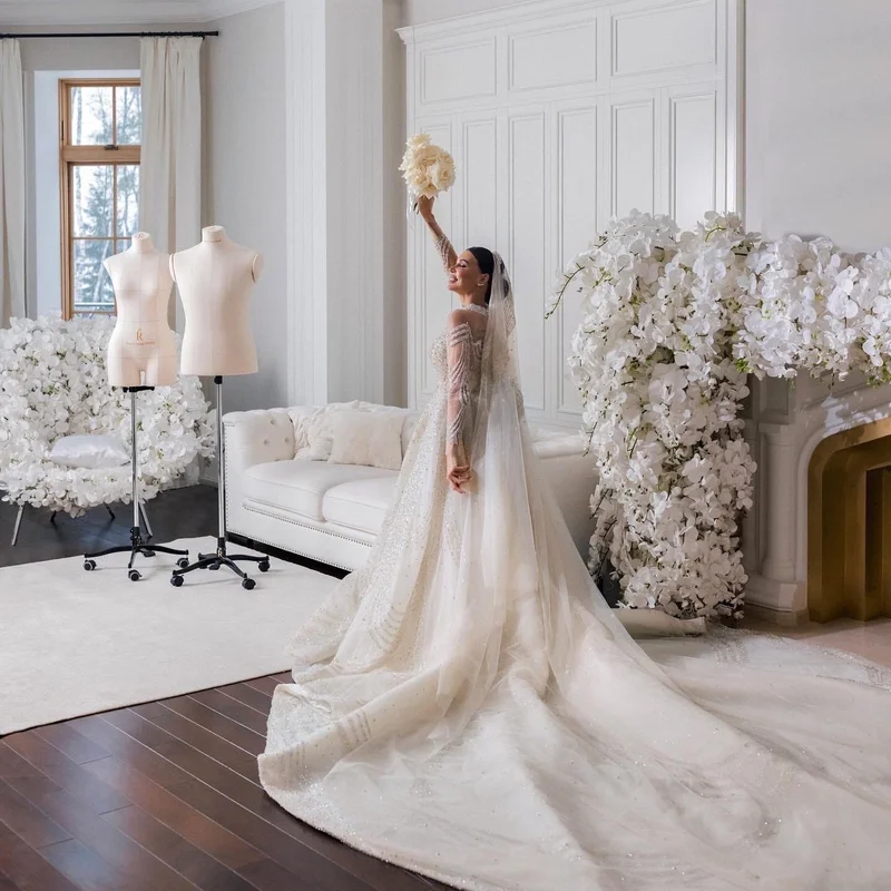 Белое платье с длинным шлейфом, расшитое камнями выглядит как мечта любой невесты. Невероятной красоты наряд модные знатоки оценили в 2,5 миллиона. Оксана же прокомментировала, что вес этого творения около 15 килограмм.