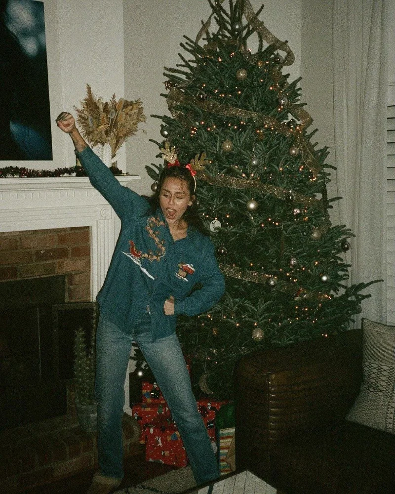 Красотка Майли порадовала подписчиков забавным фото у рождественской елки. Рубашка с принтом в виде саней Санты и золотистый ободок с рожками - идеальный праздничный образ.