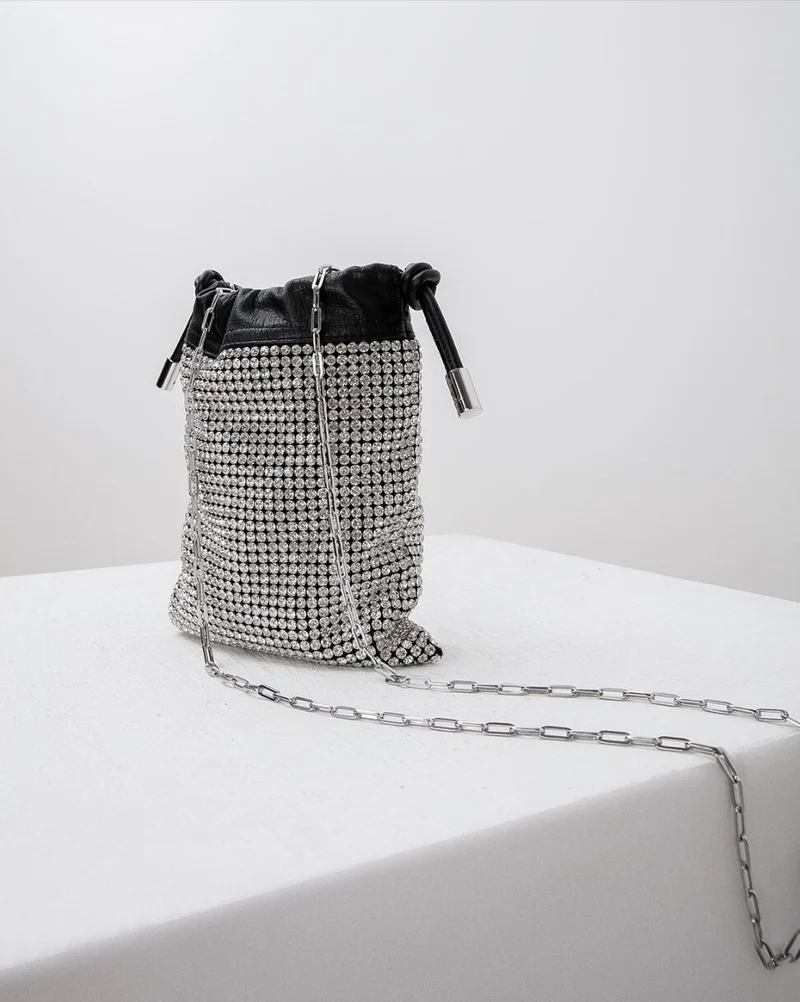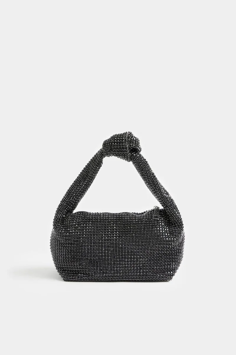 Мягкая сумка с черными кристаллами и узлом на ручке - интересный и стильный выбор. Такая модель будет отлично смотреться не только с праздничными платьями, но и с джинсами или костюмами.