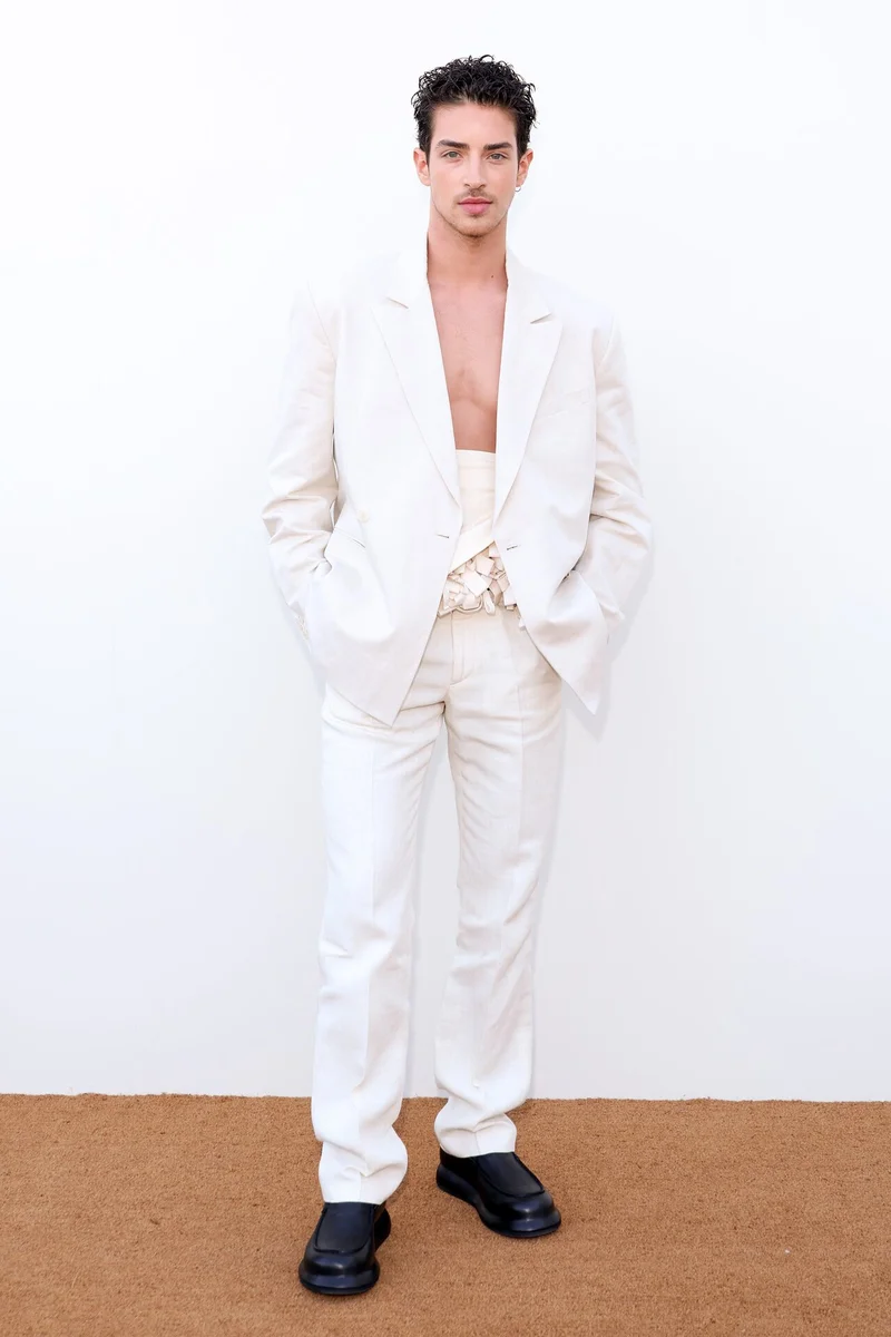 Молодой актер из Испании привлекает к себе внимание белым костюмом поверх открытого торса. Стильный и красивый парень.